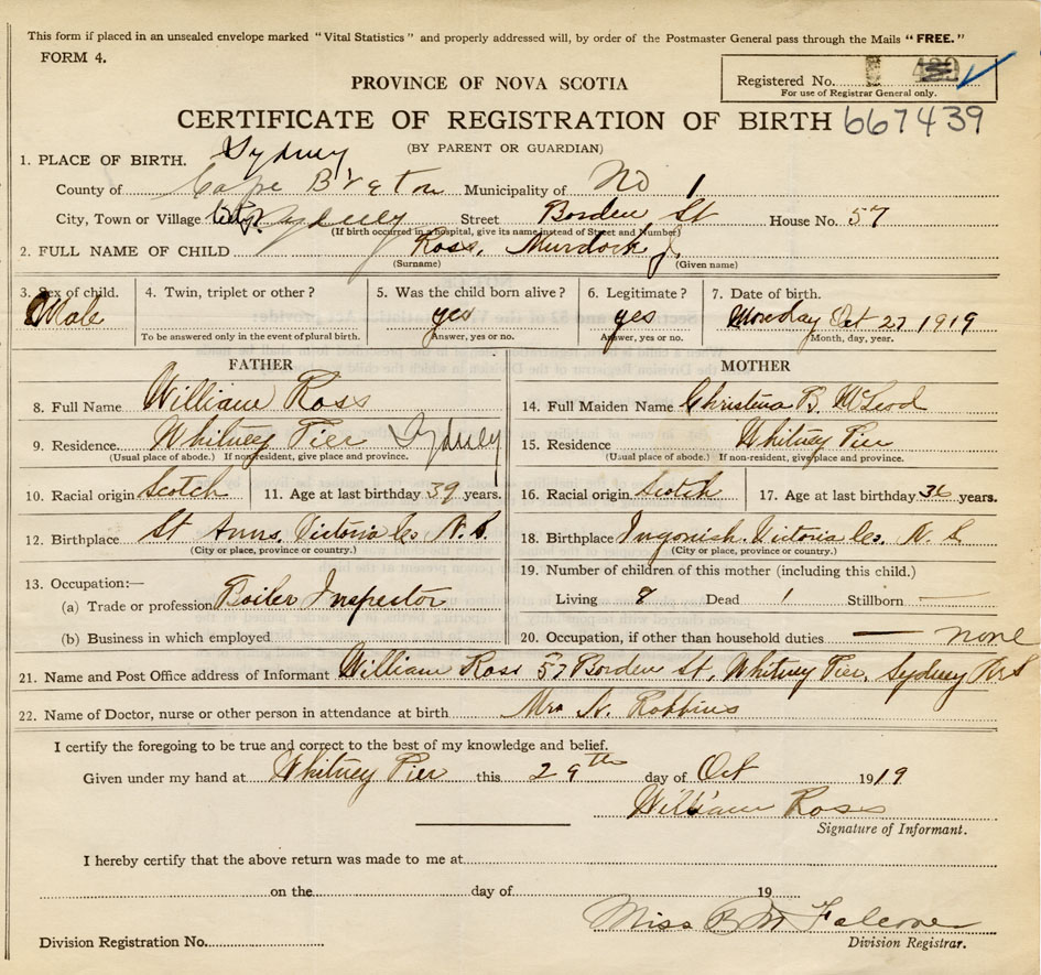Date of Birth October 27, 1919 Place of Birth SydneyCounty of Cape Breton