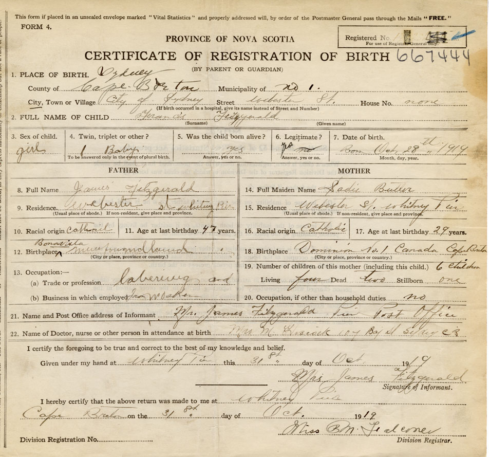 Date of Birth October 28, 1919 Place of Birth SydneyCounty of Cape Breton