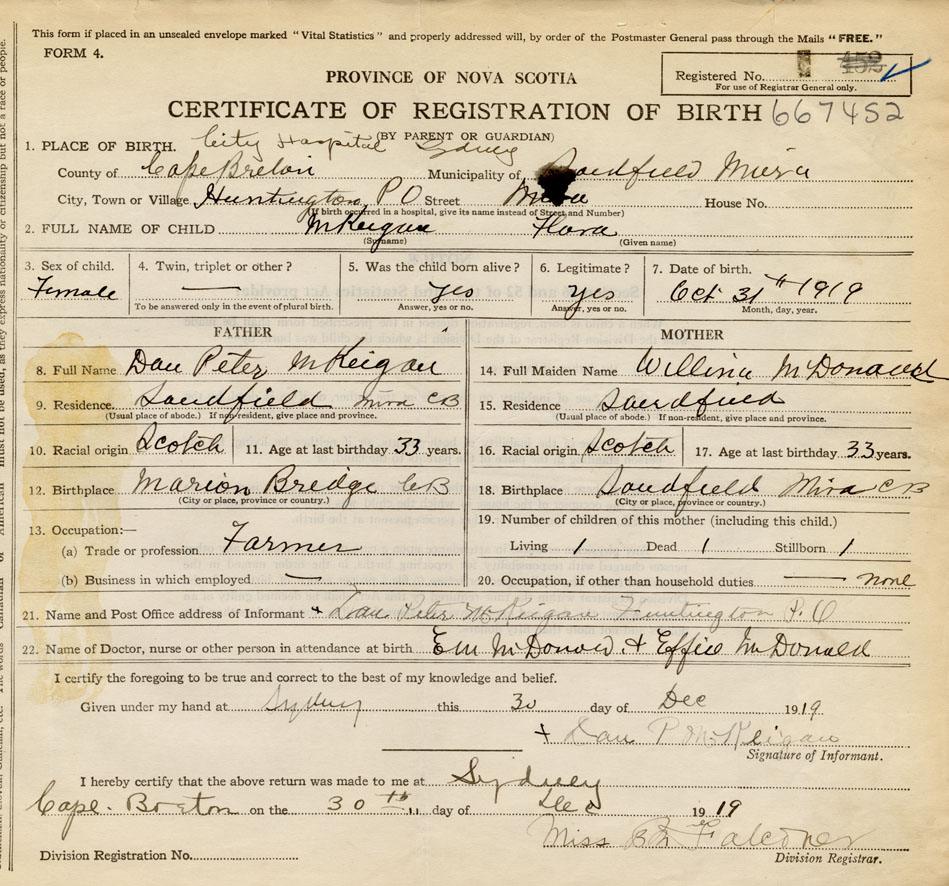 Date of Birth October 31, 1919 Place of Birth SandfieldCounty of Cape Breton