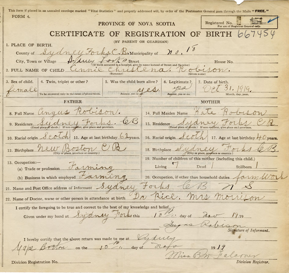 Date of Birth October 31, 1919 Place of Birth Sydney ForksCounty of Cape Breton