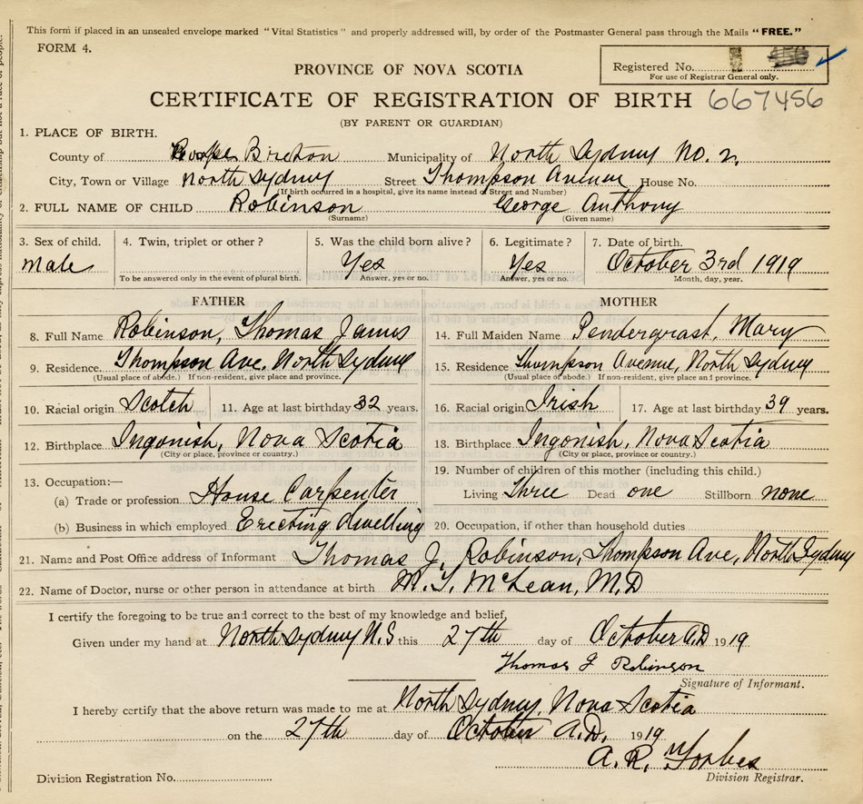 born at North Sydney Cape Breton County on October 3, 1919