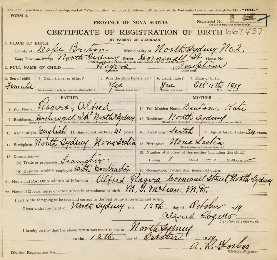 Born at North Sydney in the County of Cape Breton