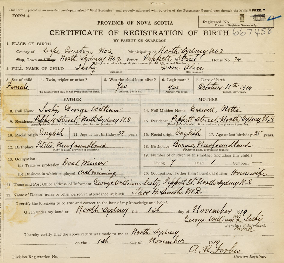 Date of Birth October 11, 1919 Place of Birth North SydneyCounty of Cape Breton