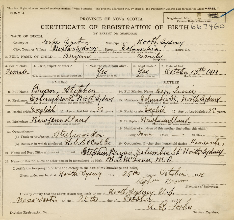 Occupation of Father at Birth of child Steel worker Place of birth of Father Newfoundland