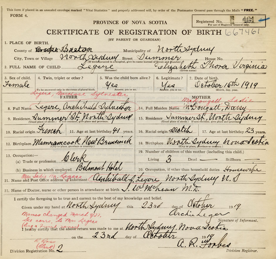 Name of Father Narcisse Sylvester Legere MAIDEN NAME of Mother Sadie McDougall
