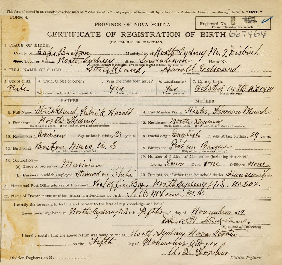 Date of Birth October 20, 1919 Place of Birth North SydneyCounty of Cape Breton