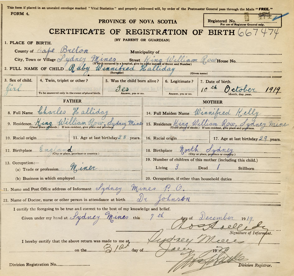 born at Sydney Mines Cape Breton County on October 10, 1919