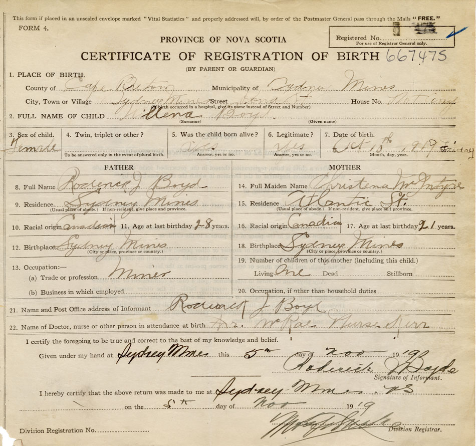 born at Sydney Mines Cape Breton County on October 10, 1919