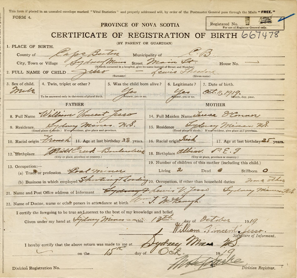 Born at Sydney Mines in the County of Cape Breton
