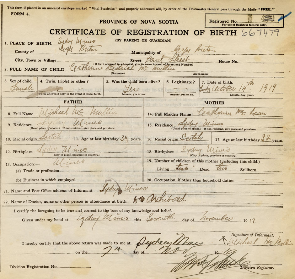 born at Sydney Mines Cape Breton County on October 14, 1919