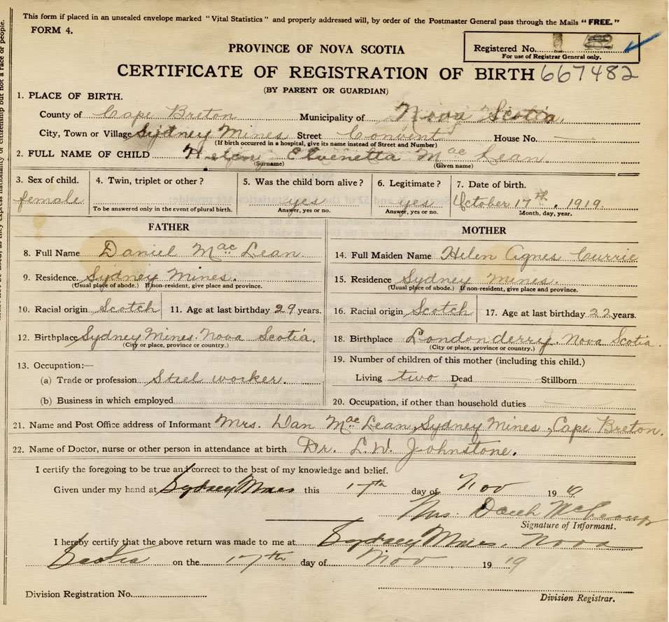 born at Sydney Mines Cape Breton County on October 17, 1919
