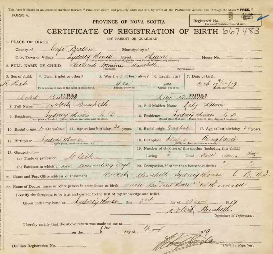 born at Sydney Mines Cape Breton County on October 17, 1919