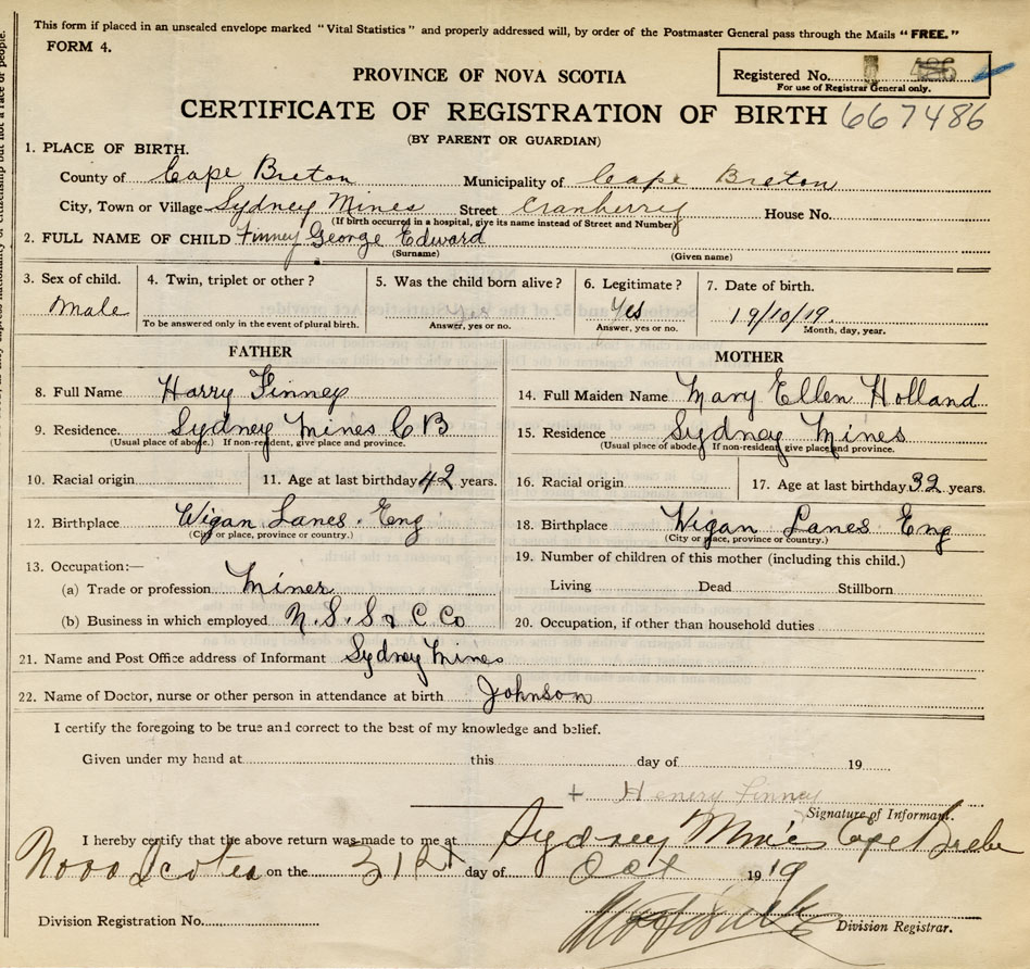 Born at Sydney Mines in the County of Cape Breton