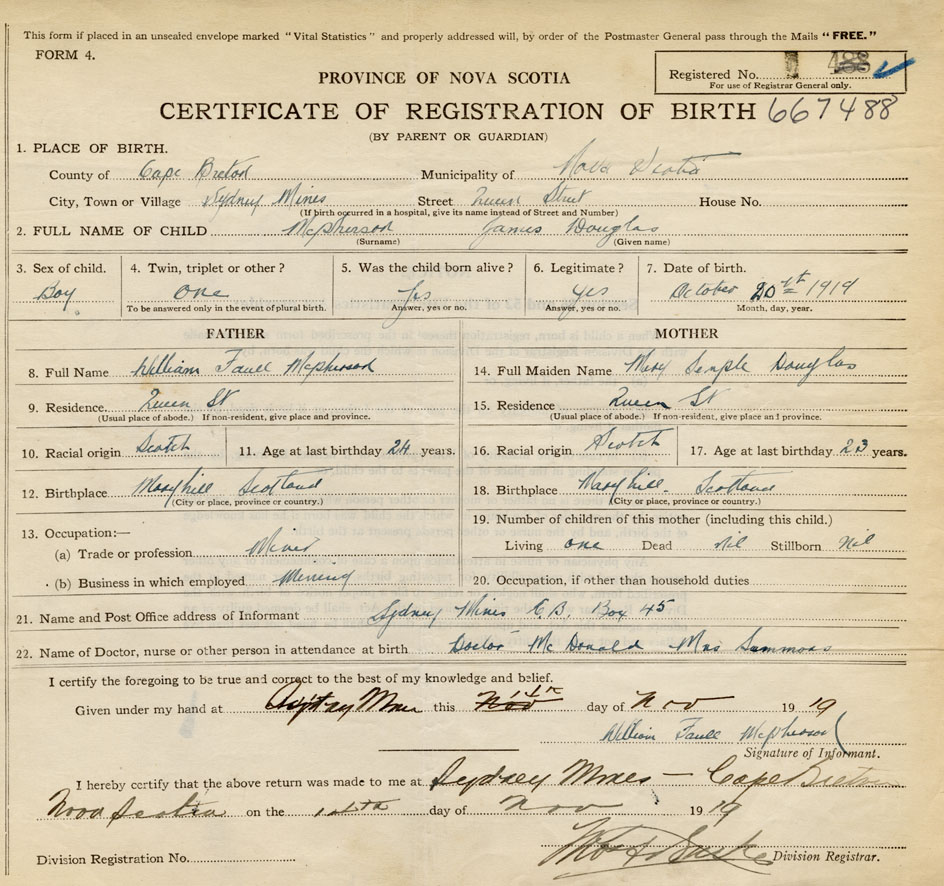 Born at Sydney Mines in the County of Cape Breton