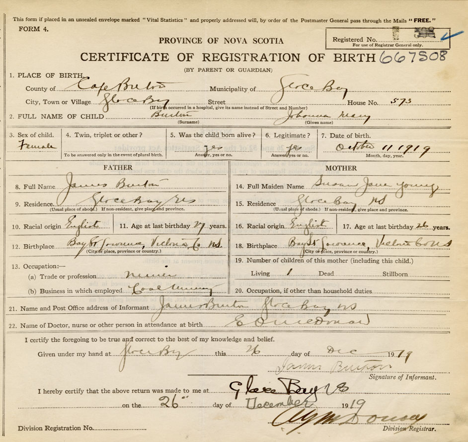 Date of Birth October 11, 1919 Place of Birth Glace BayCounty of Cape Breton