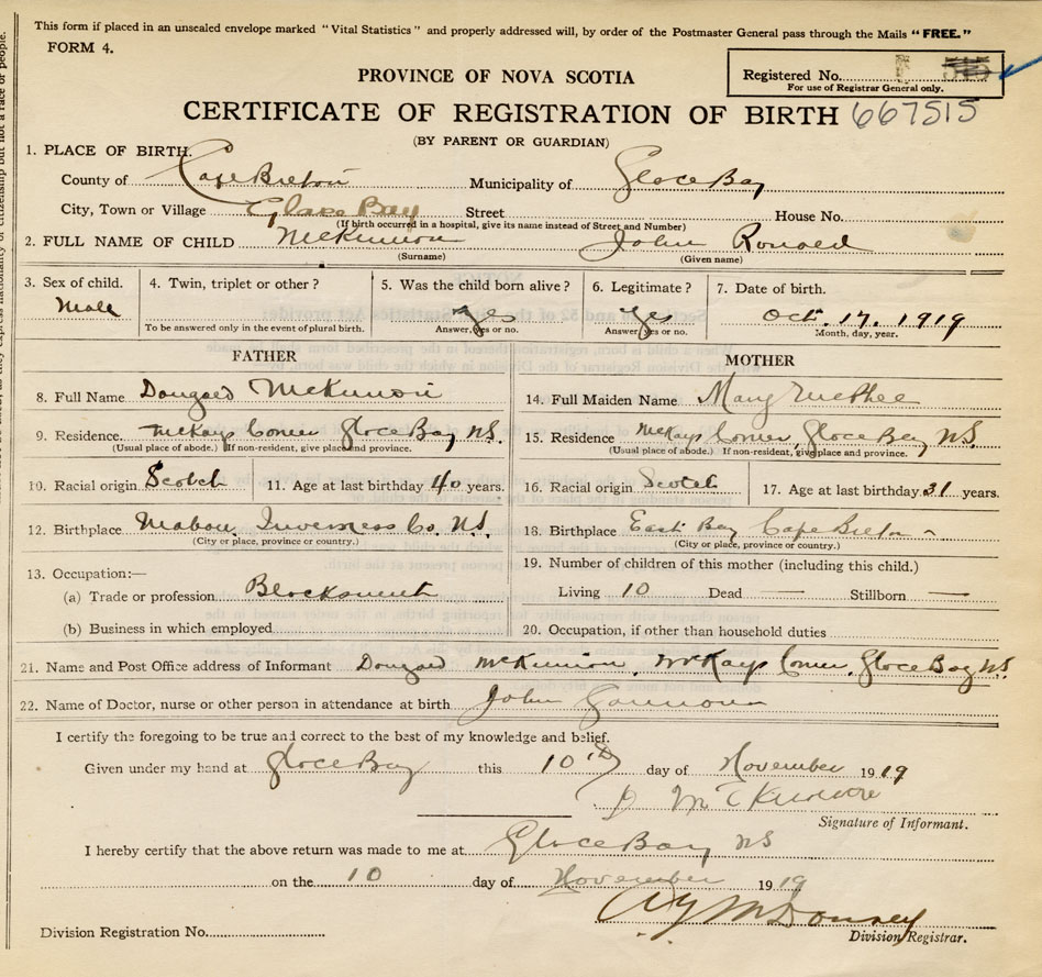 Date of Birth October 17, 1919 Place of Birth Glace BayCounty of Cape Breton
