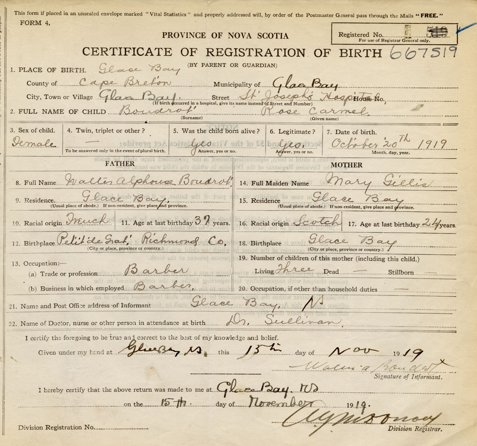 Date of Birth October 20, 1919 Place of Birth Glace BayCounty of Cape Breton