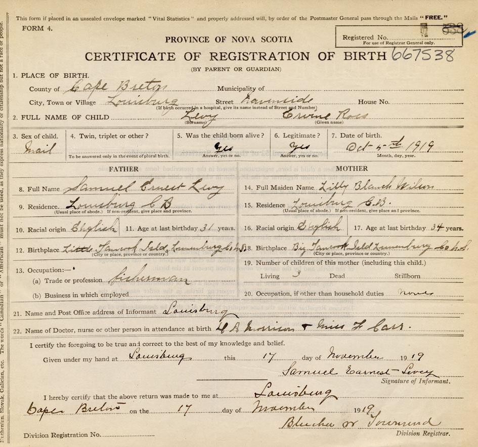 Date of Birth October 5, 1919 Place of Birth LouisburgCounty of Cape Breton