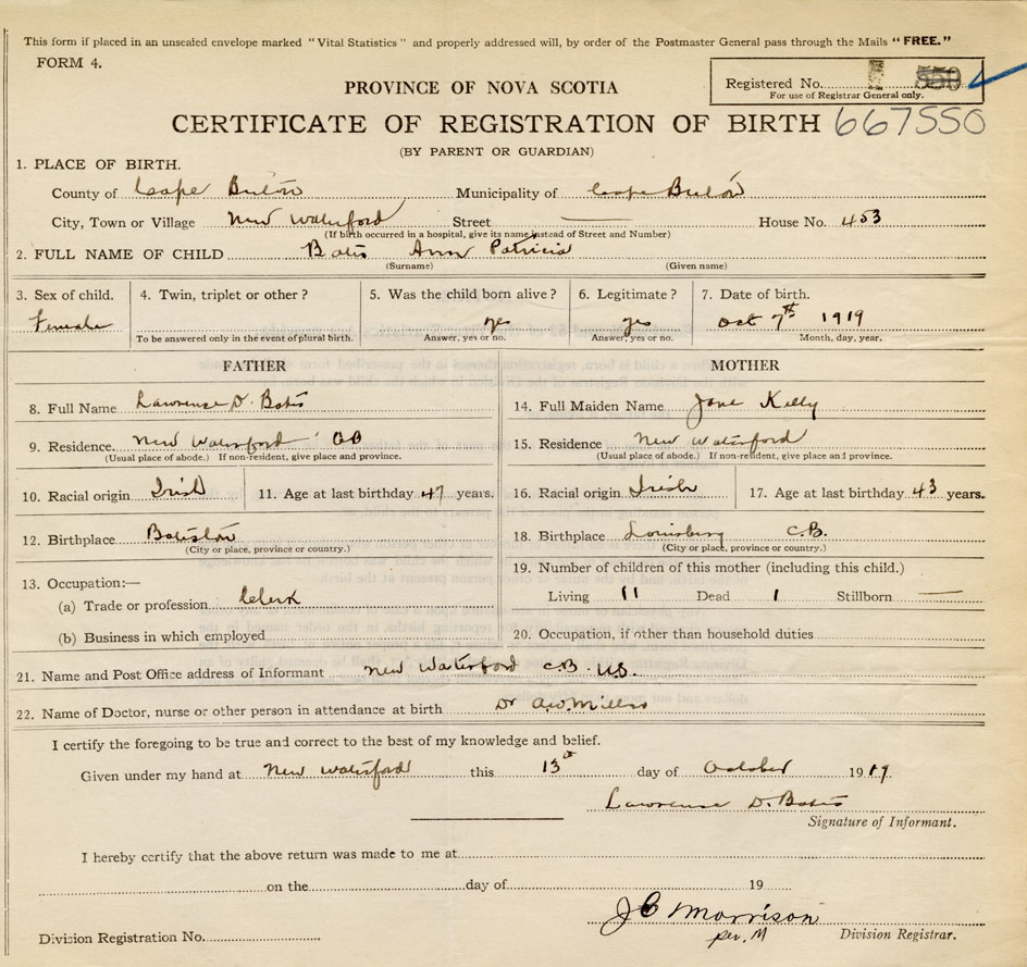 Date of Birth October 7, 1919 Place of Birth New WaterfordCounty of Cape Breton