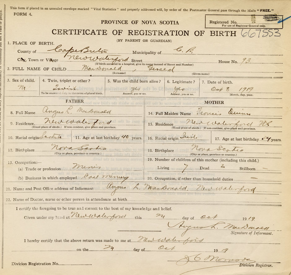 21. Name and Post Office address of Informant Angus L. MacDonald New Waterford