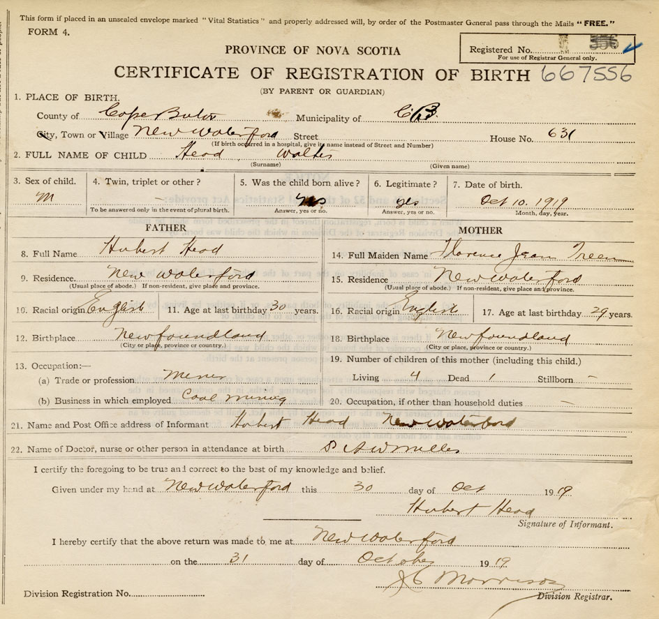 born at New Waterford Cape Breton County on October 10, 1919