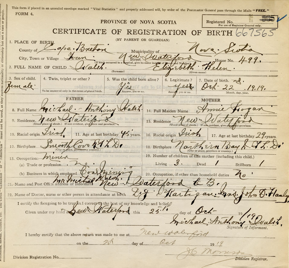 Date of Birth October 22, 1919 Place of Birth New WaterfordCounty of Cape Breton
