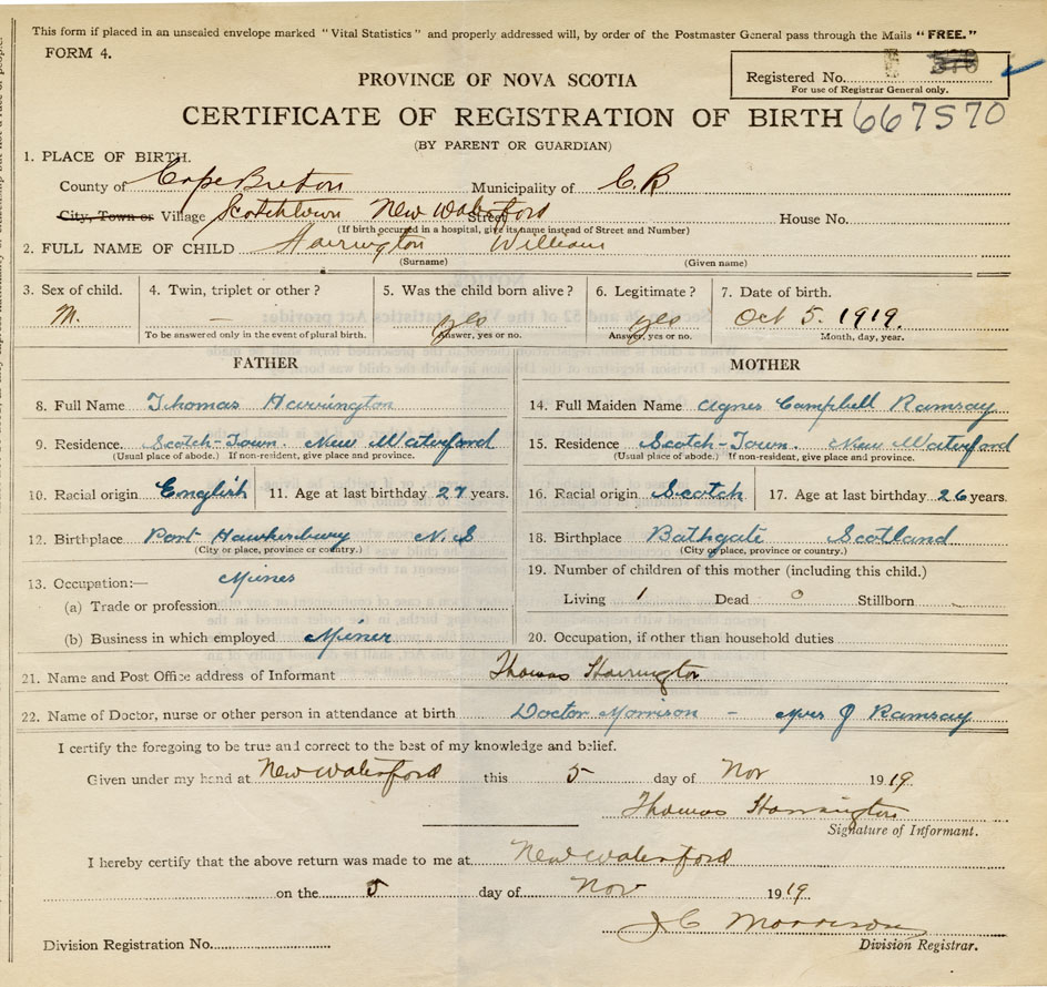 Date of Birth October 5, 1919 Place of Birth New WaterfordCounty of Cape Breton