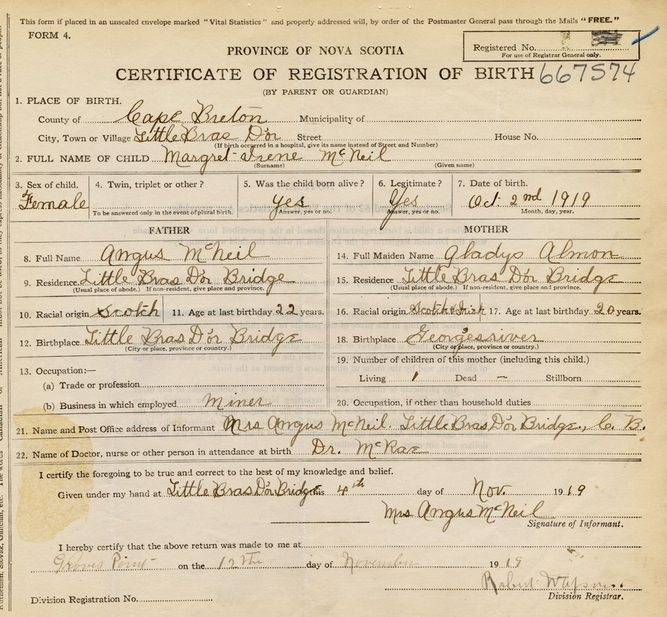 Date of Birth October 2, 1919 Place of Birth Little Bras D'OrCounty of Cape Breton