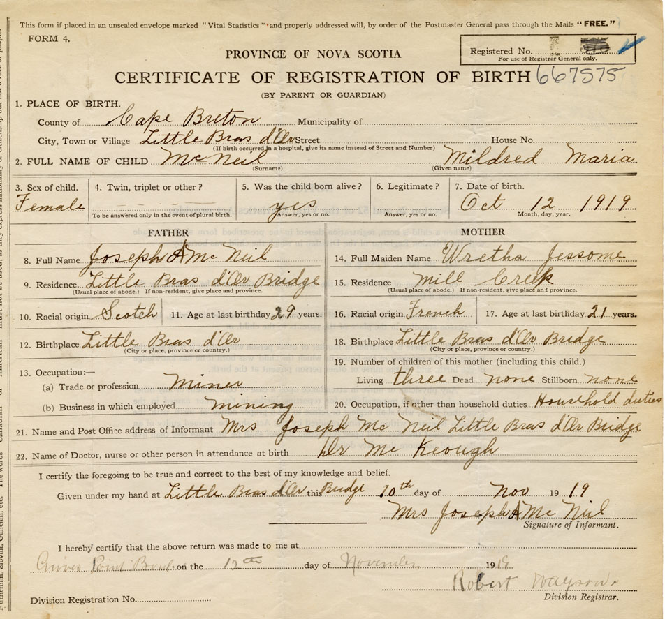 Date of Birth October 12, 1919 Place of Birth Little Bras D'OrCounty of Cape Breton