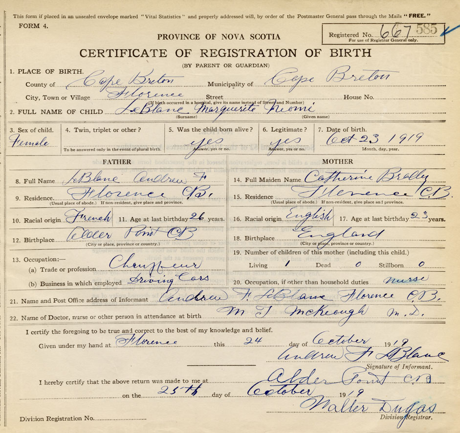 I hereby make application for the Registration of Birth of Marguerite NeomiLeBlanc Sex Female