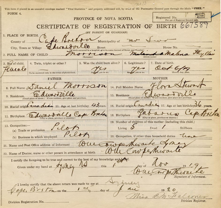 Date of Birth October 6, 1919 Place of Birth EdwardvilleCounty of Cape Breton