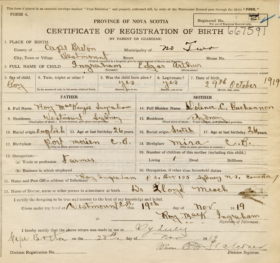 Date of Birth October 29, 1919 Place of Birth WestmountCounty of Cape Breton