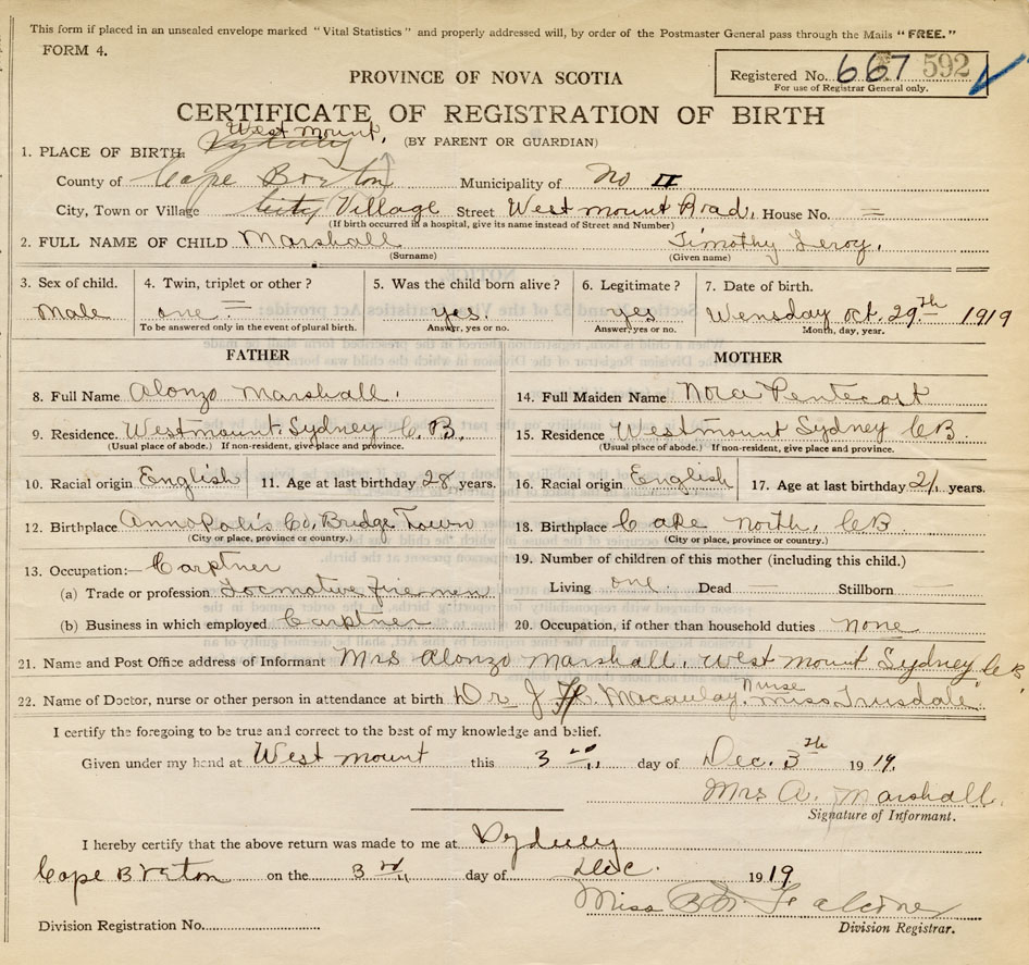 Date of Birth October 29, 1919 Place of Birth WestmountCounty of Cape Breton