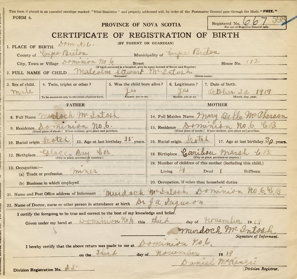 Name of Father Murdoch McIntosh MAIDEN NAME of Mother Mary Belle McPherson