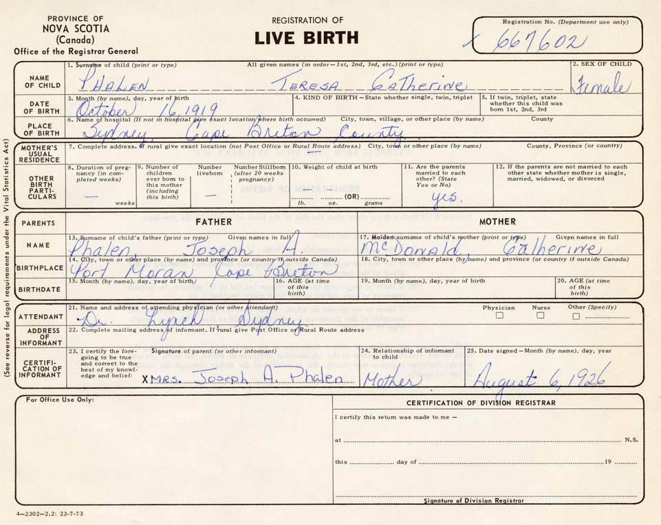 Date of Birth October 16, 1919 Place of Birth SydneyCounty of Cape Breton