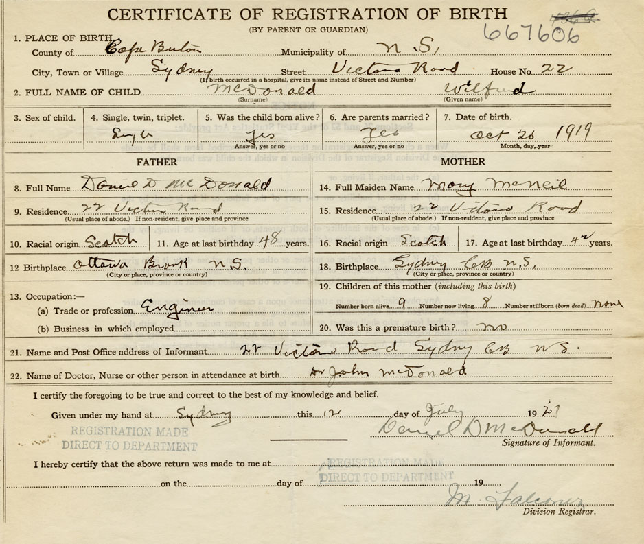 Date of Birth October 20, 1919 Place of Birth SydneyCounty of Cape Breton