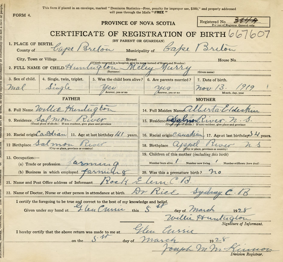 Date of Birth November 13, 1919 Place of Birth Salmon RiverCounty of Cape Breton