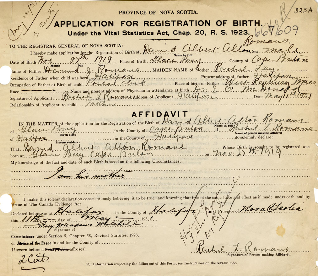 I hereby make application for the Registration of Birth of David Albert AltonRomans Sex Male
