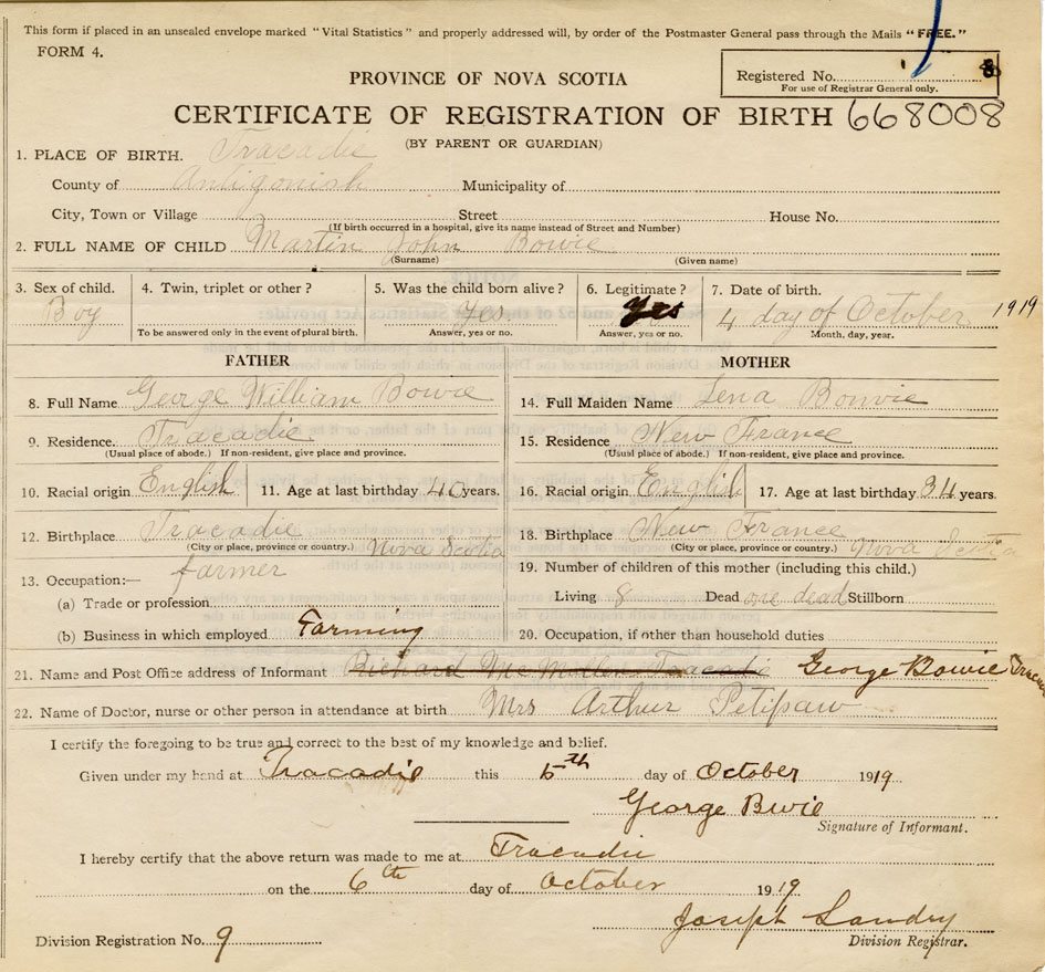 21. Name and Post Office address of Informant George Bowie Tracadie