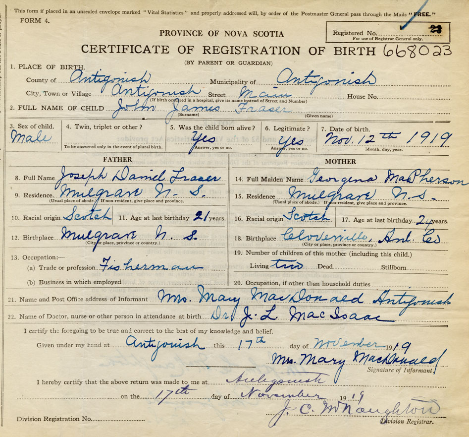 22. Name of Doctor, nurse or other person in attendance at birth Dr. J.L. MacIsaac
