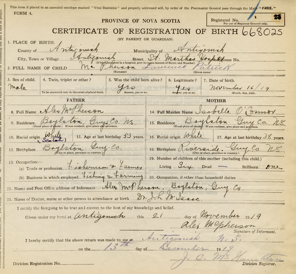 22. Name of Doctor, nurse or other person in attendance at birth Dr. J.L. McIsaac