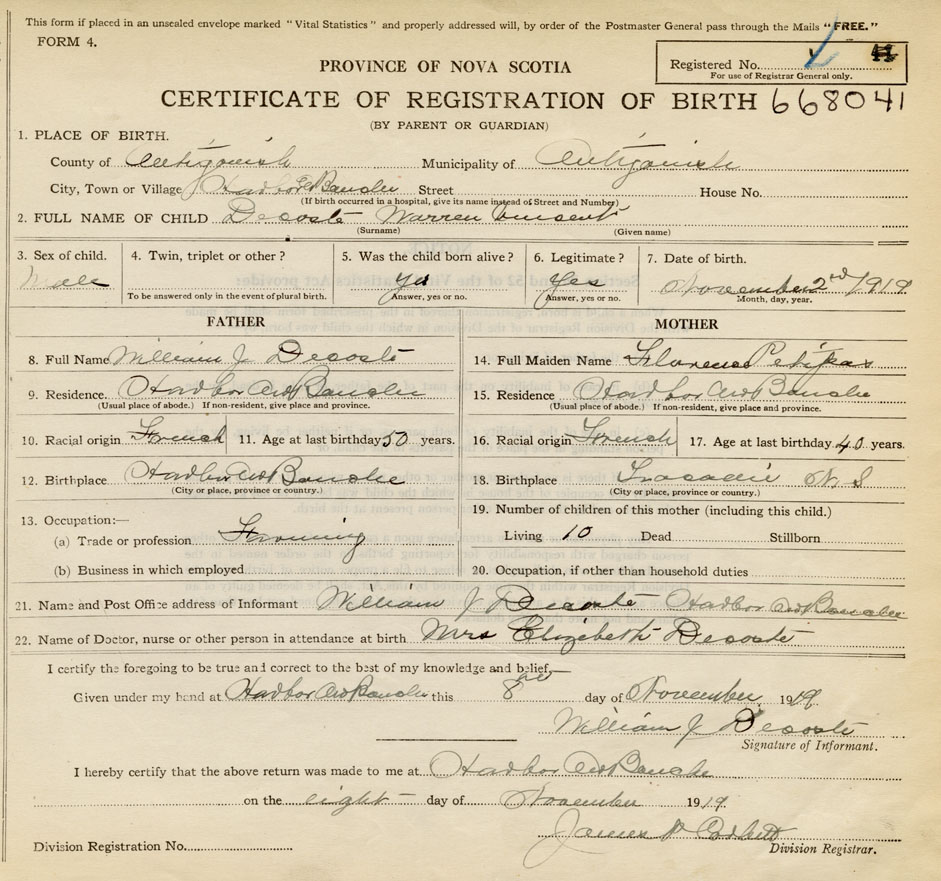 21. Name and Post Office address of Informant William J. Decoste Harbour au Bouche