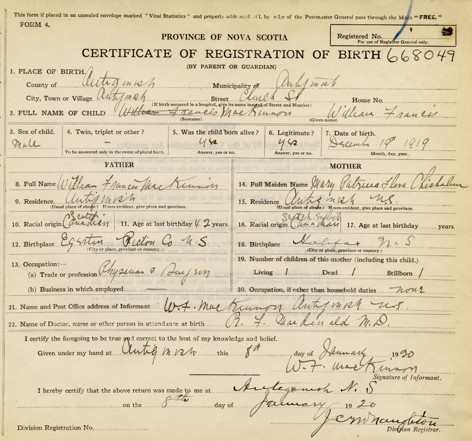 2. FULL NAME OF CHILD MacKinnon, William Francis
