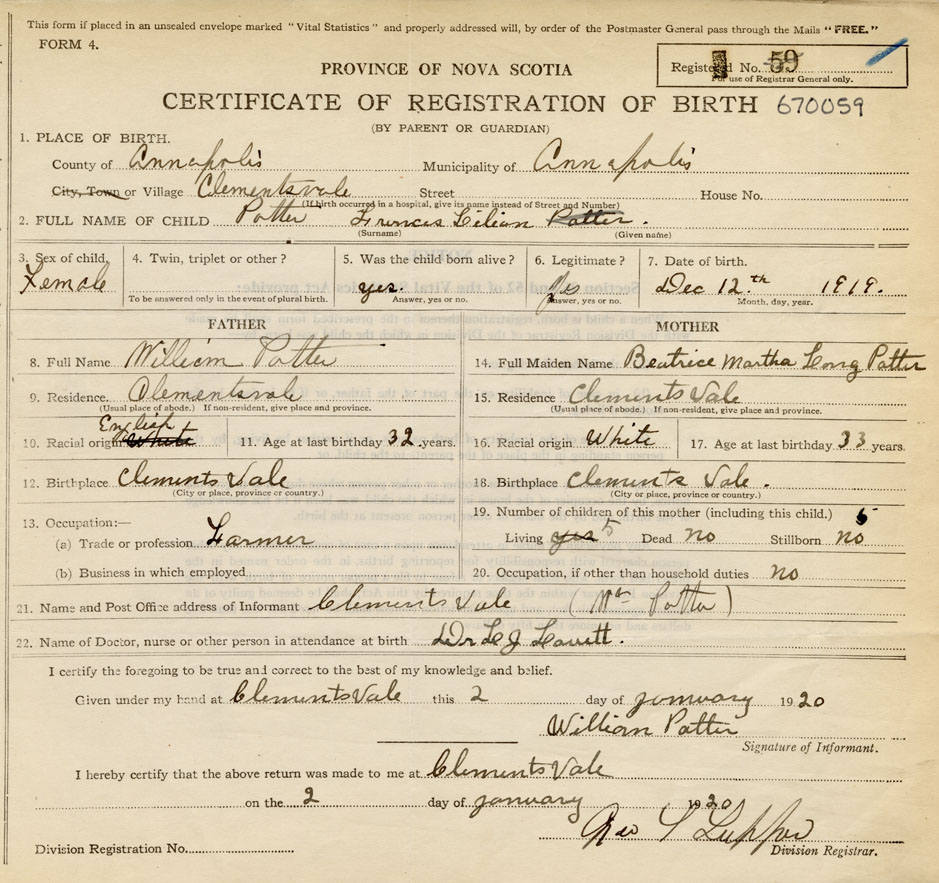 21. Name and Post Office address of Informant Mrs. Potter Clementsvale