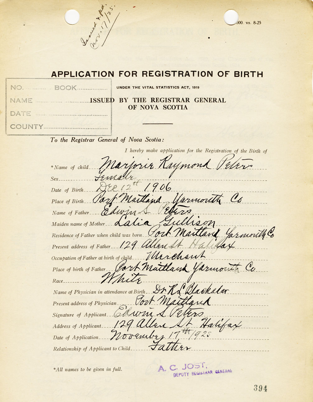 Date of Birth December 12, 1906 Place of Birth Port MaitlandCounty of Yarmouth