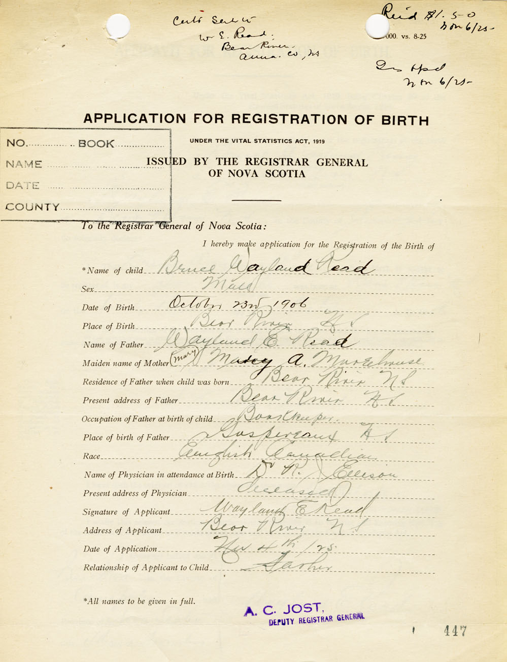 born at Bear River Kings County on October 23, 1906