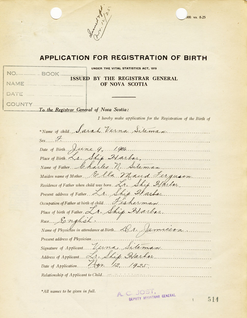 21. Name and Post Office address of Informant Verna Siteman Lower Ship Harbour