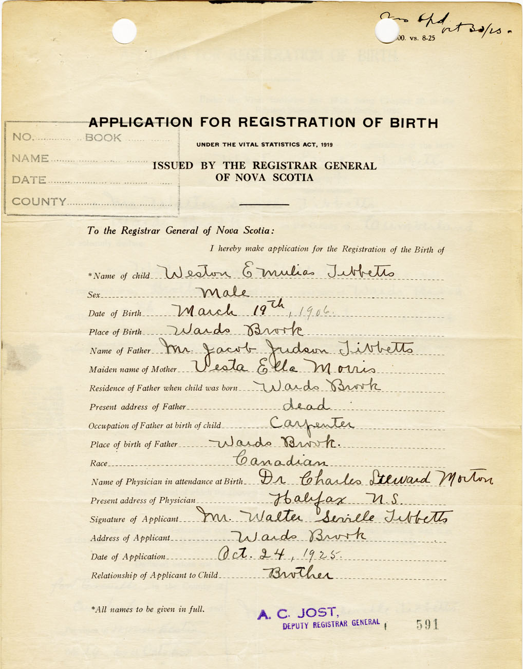 Date of Birth March 19, 1906 Place of Birth Wards BrookCounty of Cumberland