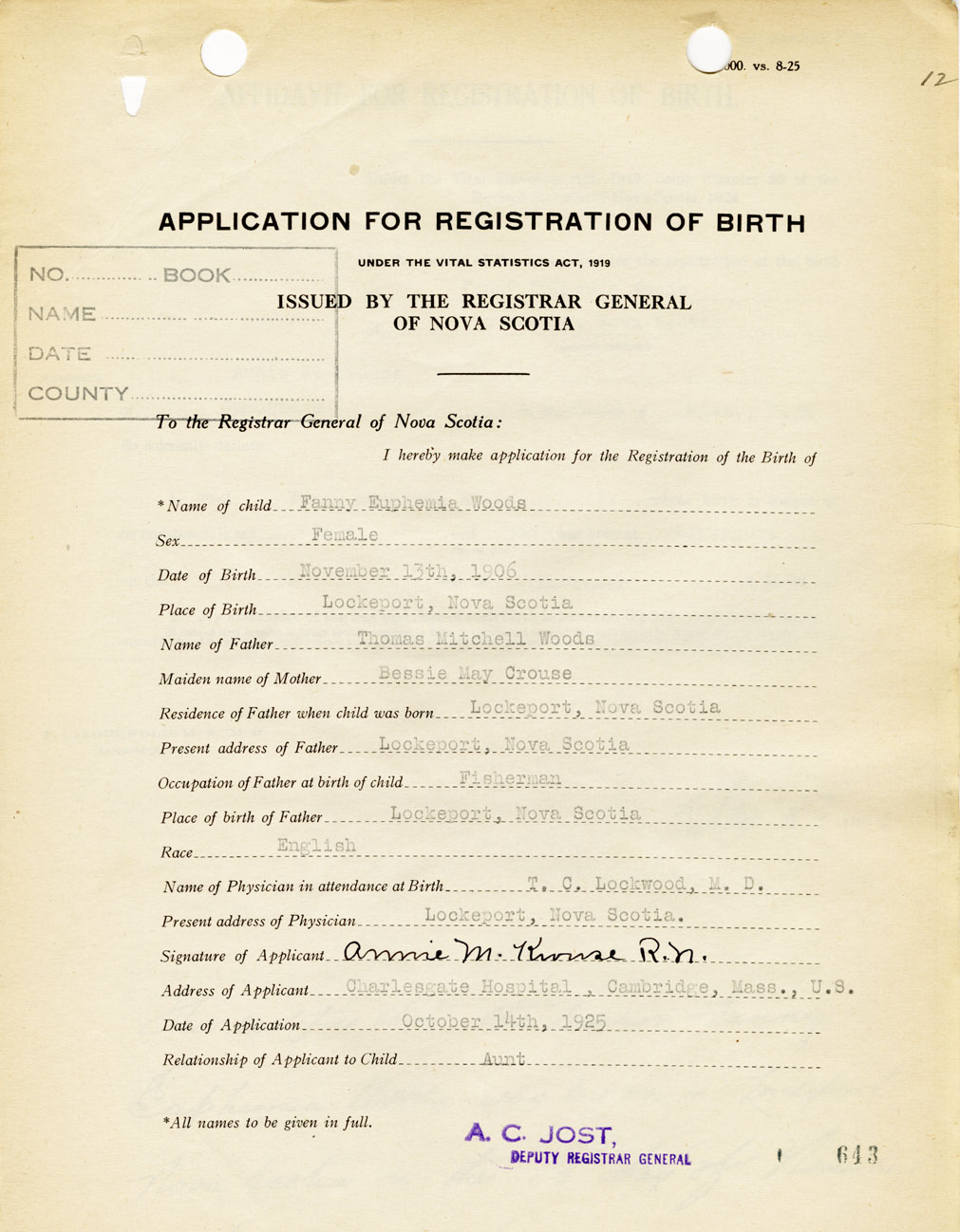 Born at Lockeport in the County of Shelburne