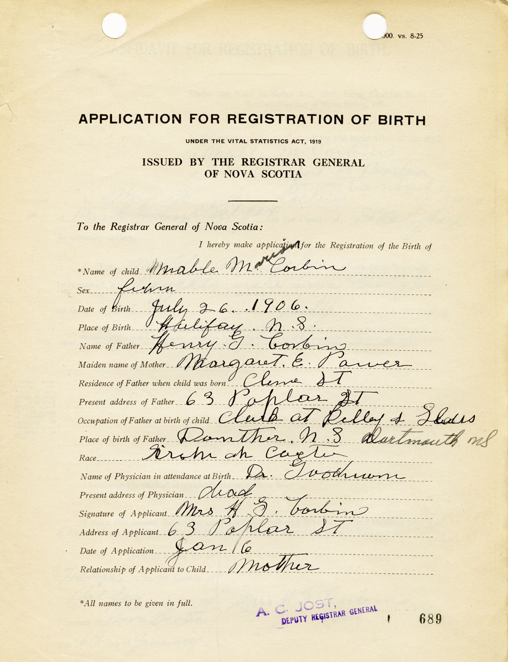 I hereby make application for the Registration of Birth of Mable MarionCorbin Sex Female